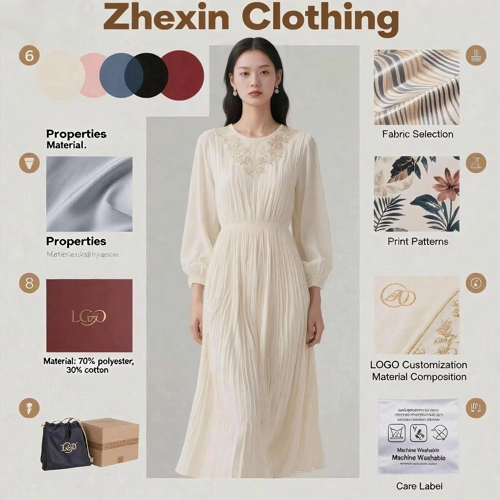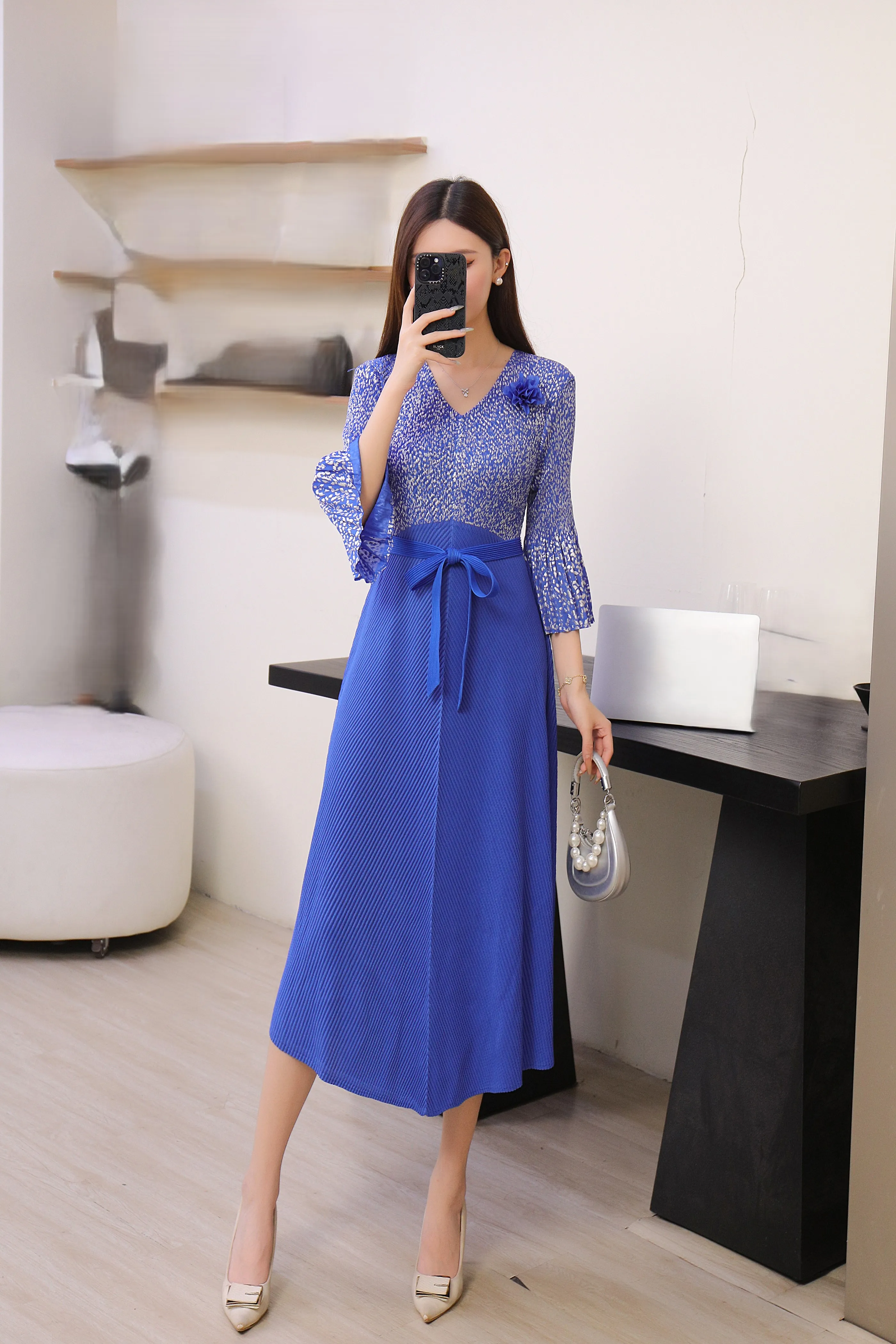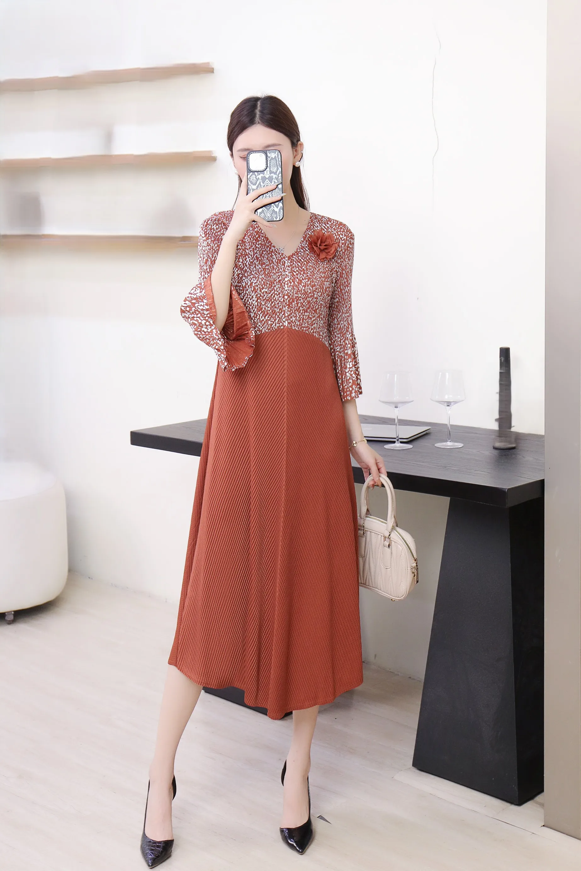 2025 Summer New Design: Embossed V-neck Floral Pattern Mid-Length Long-Sleeved Plus-Sized Ruffled Dress
